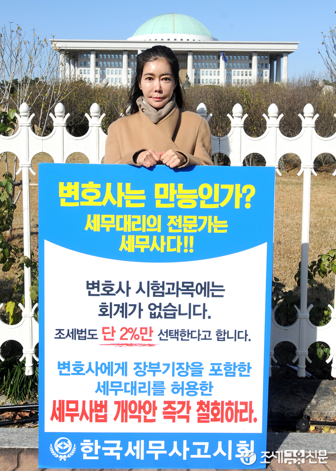 (조세금융신문=김용진 기자) 곽장미 한국세무사고시회 회장이 19일 오후 국회 정문 앞에서 변호사에게 장부 기장을 포함한 세무대리를 허용한 세무사법 개악안 철회를 촉구하는 1인시위를 하고 있다.