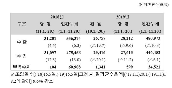 관세청이 21일 발표한 자료에 따르면, 수출은 전년 동기에 비해 9.6% 감소해 282억 달러를, 수입은 11.2% 감소해 276억 달러를 기록했다.