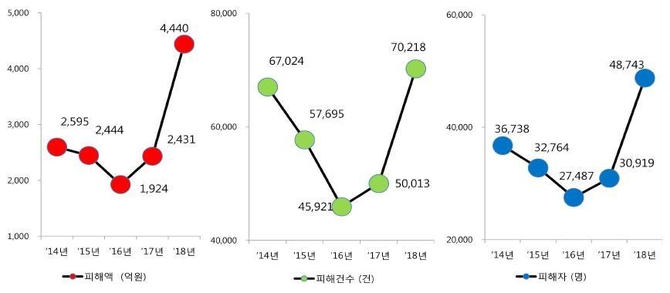 올해 상반기 피해액은 3322억원으로, 이미 작년 전체 피해액의 절반을 넘어섰다. 피해자도 2017년 3만919명에서 작년 4만8743명으로 58%가량 늘었다.