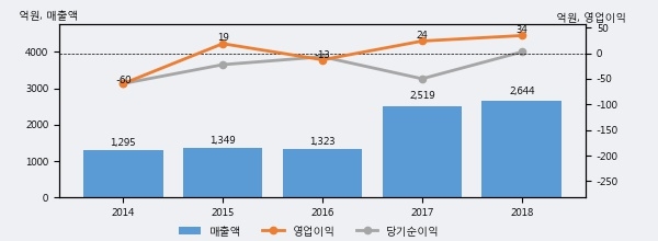 최근 실적을 살펴보면 2018년 매출액이 최근 5년 중 가장 높은 실적을 기록했음을 알 수 있다. 이전 최고 실적이었던 2017년 보다도 4.9%(124억 4천만원) 늘어난 것으로 나타났다.