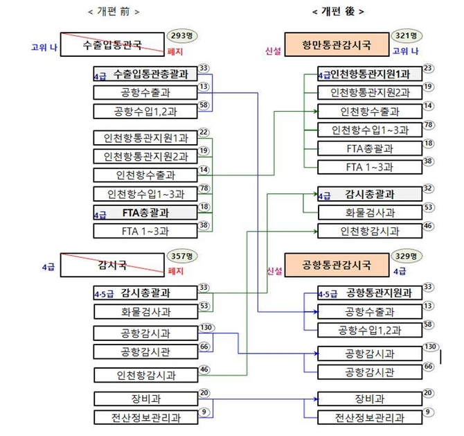 개편안에 따르면, 수출입통관업무와 감시업무를 담당하는 인천세관의 수출입통관국과 감시국이 폐지되고 각각 항만통관감시국과 공항통관감시국이 신설된다.