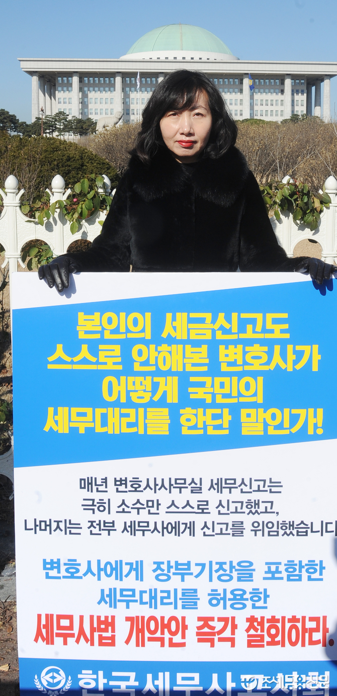 (조세금융신문=김용진 기자) 천혜영 한국세무사고시회 홍보 부회장이 29일 오전 국회 정문 앞에서 변호사에게 장부 기장을 포함한 세무대리를 허용한 세무사법 개악안 즉각 철회 주장하는 1인시위를 하고 있다.