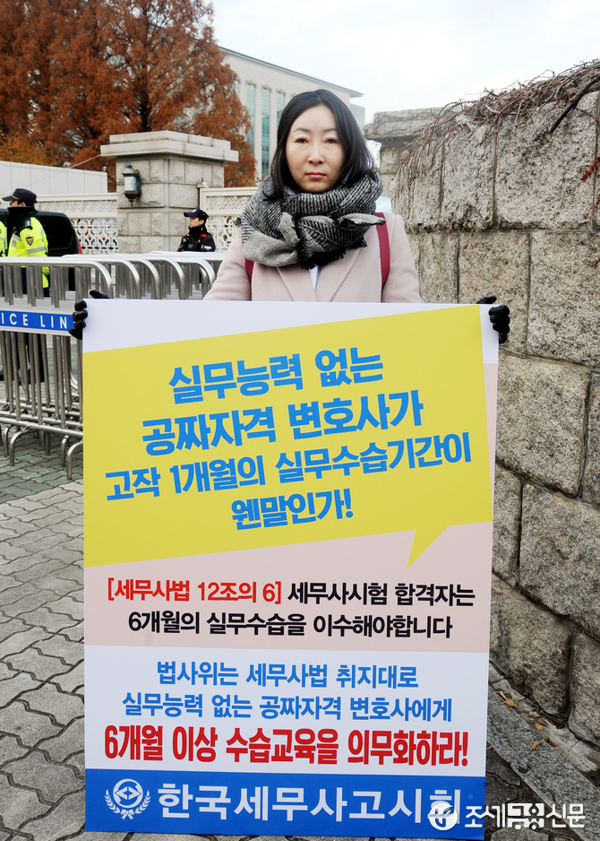 (조세금융신문=김용진 기자) 배미영 한국세무사고시회 상임 이사가 3일 오전 국회 정문 앞에서 법사위는 세무사법 취지 대로 실무 능력 없는 공짜자격 변호사에게 6개월 이상 수습교육을 의무화 하라는 1인 시위를 하고 있다.
