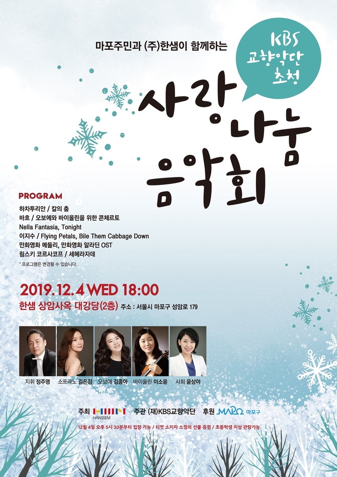 (조세금융신문=김소현 기자) 한샘이 4일 오후 6시부터 상암사옥 2층 대강당에서 'KBS 교향악단 초청 사랑나눔 음악회'를 개최한다.