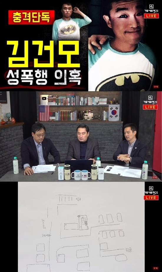6일 유튜브 채널 가로세로연구소에서는 '김건모 성폭행 의혹!!!!'이라는 제목으로 토크가 펼쳐진 가운데 진행자들은 김건모가 강남의 한 유흥주점에서 한 여성을 성폭행했다고 말했다.