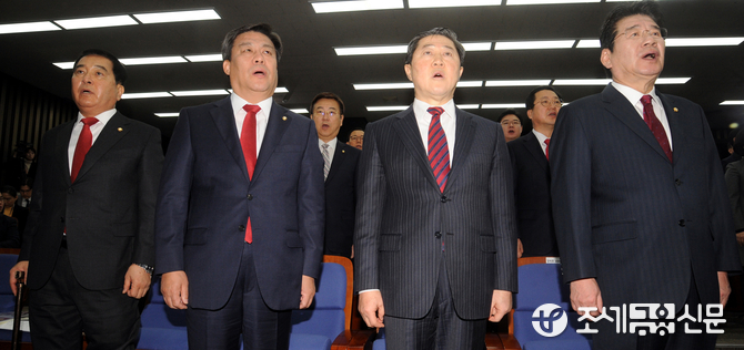 (조세금융신문=김용진 기자) 20대 국회 마지막 원내대표 선출을 위한 자유한국당 의원총회가 열린 9일 오전 국회에서 애국가를 제창하고 있다.(오른쪽부터) 심재철, 김선동, 유기준, 강석호 후보