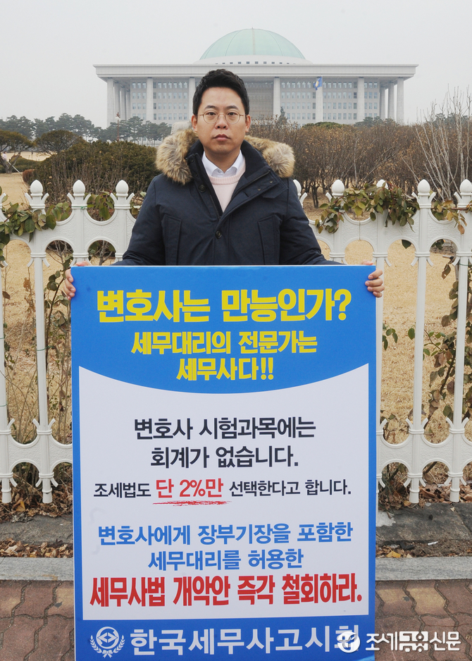 (조세금융신문=김용진 기자) 김희철 한국세무사고시회 사업부회장이 9일 오후 국회 정문 앞에서 변호사에게 장부 기장을 포함한 세무대리를 허용한 세무사법 개악안 철회를 촉구하는 1인시위를 하고 있다.