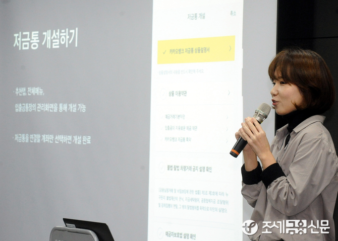 (조세금융신문=김용진 기자) 길레나 한국카카오 채널파트 매니저가 10일 오전 서울 용산 KDB 생명타워 카카오뱅크 서울 오피스에서 카카오 뱅크 저금통 시연을 하고 있다.