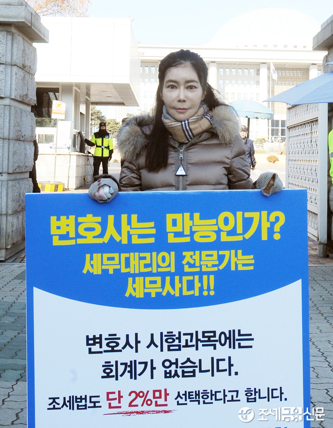 (조세금융신문=김용진 기자) 곽장미 한국세무사고시회 회장이 12일 오전 국회 정문 앞에서 기장 대행과성실 확인 업무 허용 하지 않는 세무사법을 즉각 의결하라는 1인시위를 하고있다.