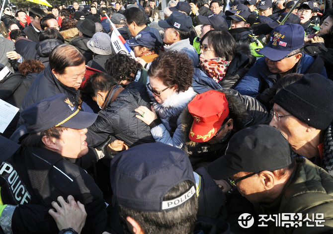 (조세금융신문=김용진 기자) 16일 오전 국회 본청 앞 계단에서 열린 '공수처법 선거법 날치기 저지 규탄대회에서 보수단체 회원들이 '공수처 반대'를 외치며 국회 본청 진입을 시도하고 있다