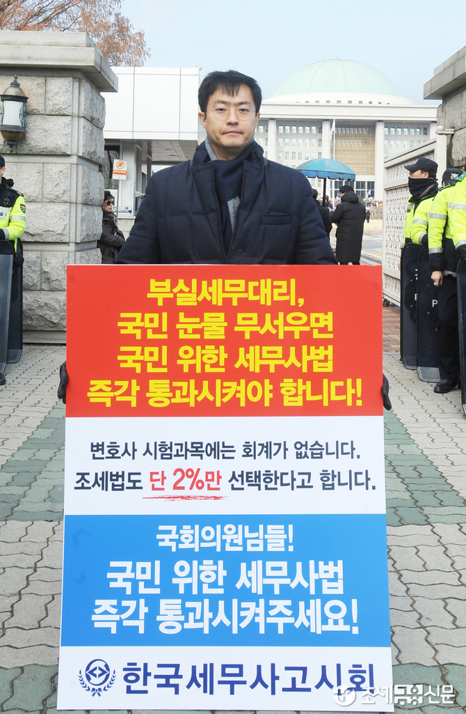 (조세금융신문=김용진 기자) 김범석 한국세무사고시회 조직 부회장이 16일 오전 국회 정문 앞에서 기장 대행과 성실확인 업무 허용하지 않는 세무사법을 즉각 의결하라는 1인시위를 하고있다.