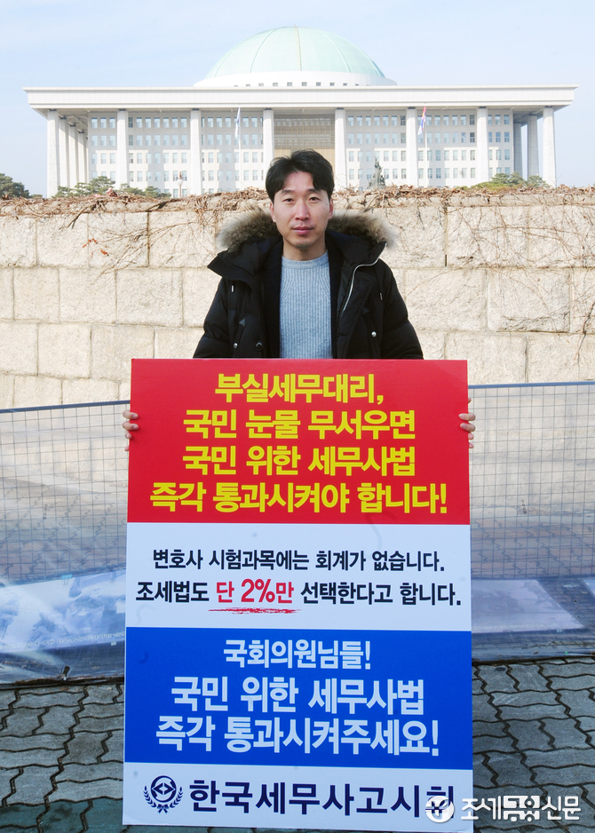 (조세금융신문=김용진 기자) 강현삼 한국세무사고시회 연수 상임이사가 18일 오후 국회 정문 앞에서 기장 대행과 성실 확인 업무 허용 하지 않는 세무사법을 즉각 의결하라는 1인시위를 하고있다.