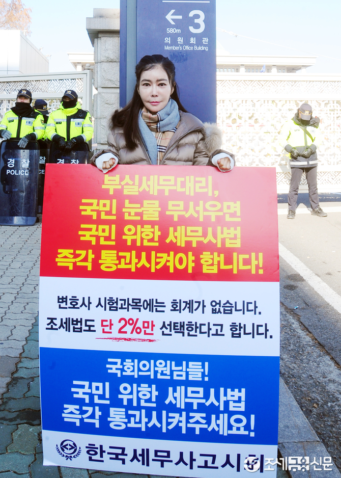 (조세금융신문=김용진 기자) 곽장미 한국세무사고시회 회장이 19일 오전 국회 정문 앞에서 기장 대행과 성실 확인 업무 허용 하지 않는 세무사법을 즉각 의결하라는 1인시위를 하고있다.