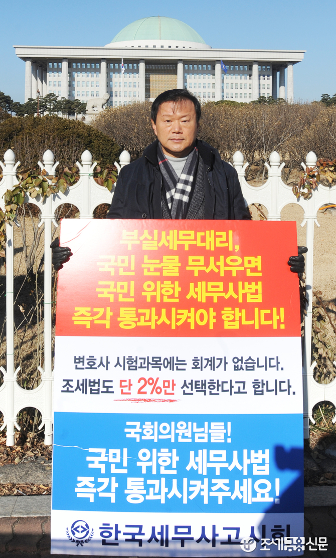 (조세금융신문=김용진 기자) 이종탁 전 한국세무사회 부회장이 20일 오전 국회 정문 앞에서 기장 대행과 성실 확인 업무 허용 하지 않는 세무사법을 즉각 의결하라는 1인시위를 하고있다.