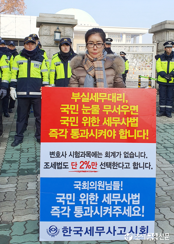 (조세금융신문=김용진 기자) 곽장미 한국세무사고시회 회장이 24일 오전 국회 정문 앞에서 기장 대행과 성실 확인 업무 허용 하지 않는 세무사법을 즉각 의결하라는 1인시위를 하고 있다. (한국세무사고시회 곽장미 회장 제공)