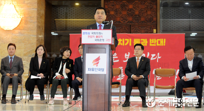 (조세금융신문=김용진 기자) 심재철 자유한국당 원내대표가 26일 오전 국회에서 열린 최고위원회의에서 모두 발언을 하고 있다.