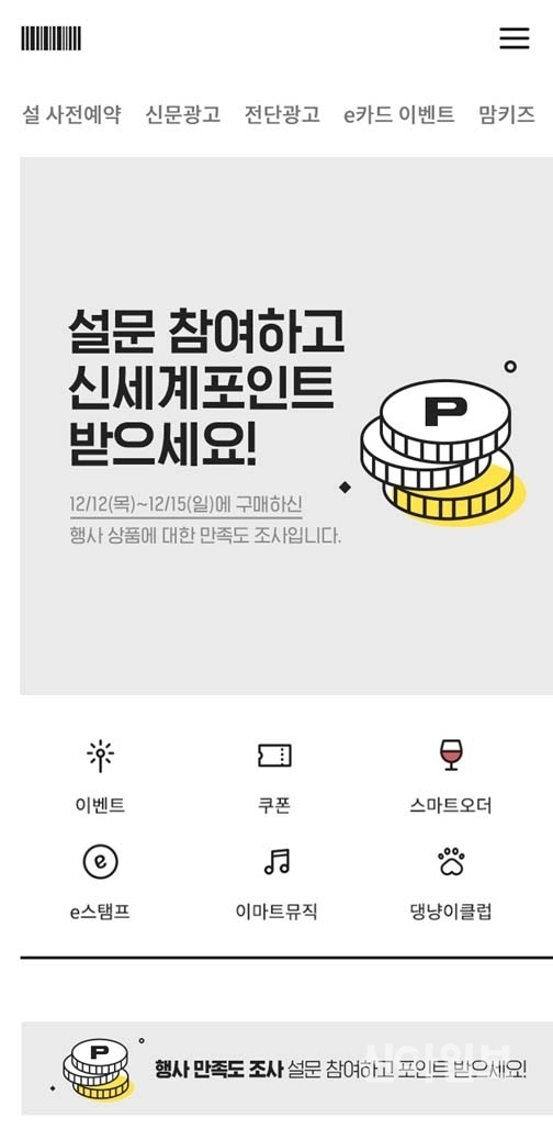 귀찮음을 조금 감수할 수 있다면, ‘설문형 앱’도 활용 할 만하다. 이마트는 소비자 소통 강화와 만족도 제고 차원에서 상품·서비스·행사·소비자 니즈(Needs) 등에 대한 설문조사를 하고, 참여한 소비자를 대상으로 각 100~500포인트(p)가량의 신세계포인트 리워드를 제공한다.