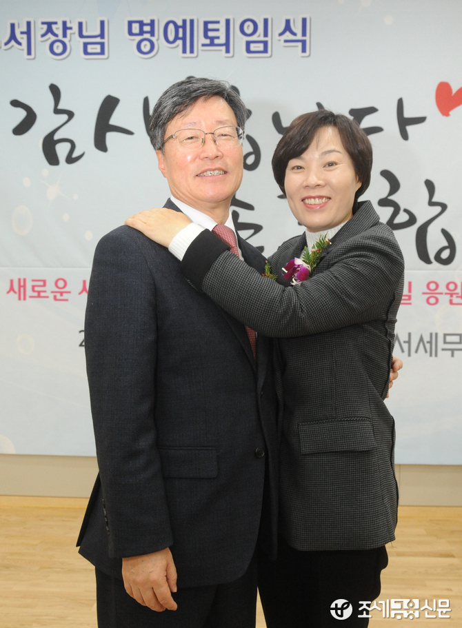 (조세금융신문=김용진 기자) 김상훈 강서세무서장이 27일 오전 서울 강서세무서에서 열린 명예 퇴임식에서 평생의 반려자인 아내에게 '공직생활 동안 수고했다'는 의미의 포옹을 받고 있다.
