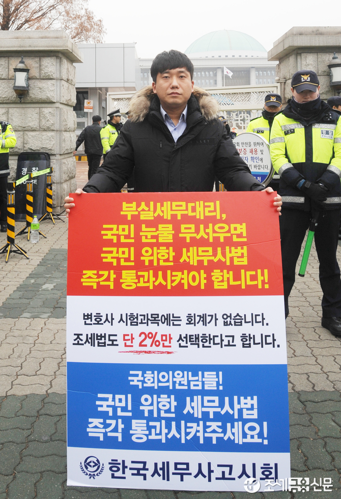 (조세금융신문=김용진 기자) 이태혁 한국세무사고시회 연구상임이사가 30일 오전 국회 정문 앞에서 기장 대행과 성실 확인 업무 허용 하지 않는 세무사법을 즉각 의결하라는 1인시위를 하고있다.