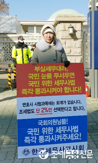 (조세금융신문=김용진 기자) 배미영 한국세무사고시회 상임 이사가 31일 오전 국회 정문 앞에서 기장 대행과 성실 확인 업무 허용 하지 않는 세무사법을 즉각 의결하라는 1인 시위를 하고있다.(사진= 한국세무사고시회 제공)