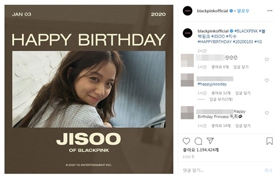 YG엔터테인먼트는 3일 블랙핑크 공식 인스타그램에서 "#BLACKPINK #블랙핑크 #JISOO #지수 #HAPPYBIRTHDAY #20200103 #YG"라는 글과 함께 블랙핑크 지수의 생일을 축하했다.