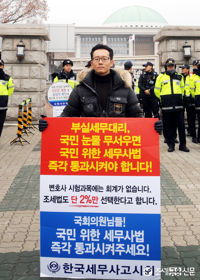 (조세금융신문=김용진 기자) 김현배 한국세무사고시회 지방청년 상임이사가 6일 오전 국회 정문 앞에서 세무사법 개정안을 즉각 의결 하라는 1인 시위를 하고 있다