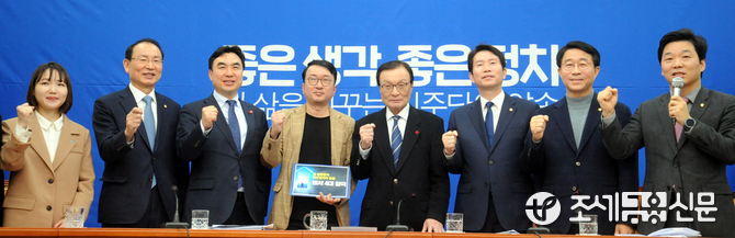 (조세금융신문=김용진 기자) 이해찬 더불어민주당 대표가 조정식 정책위의장, 이인영 원내대표, 이해찬 대표, 최성진 코리아스타트업포럼 대표, 윤관석 정책위 수석부의장이 20일 오전 국회에서 열린 '벤처 4대강국' 총선 공약을 발표하며 파이팅하고 있다.