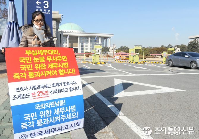 (조세금융신문=김용진 기자) 곽장미 한국세무사고시회 회장이 21일 오후 국회 정문 앞에서 세무사법 개정안을 즉각 의결하라는 1인시위를 하고있다