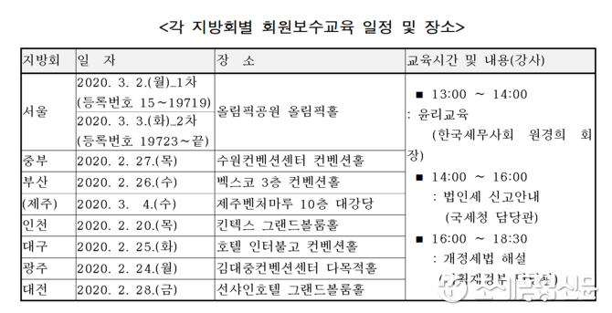 (조세금융신문=이지한 기자) 한국세무사회(회장 원경희)는 다음달 20일부터 ‘2020년 회원보수교육’을 전국 7개 지방세무사회별로 실시한다.