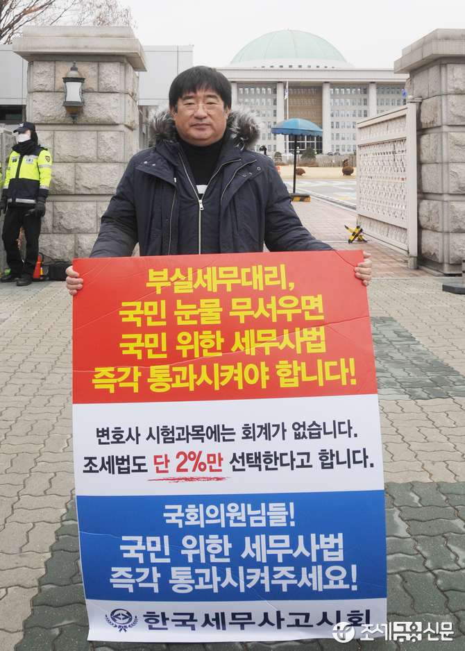(조세금융신문=김용진 기자) 이창식 한국세무사고시회 총무 부회장이 28일 오전 국회 정문 앞에서 세무사법 개정안을 즉각 의결하라는 1인시위를 하고있다.