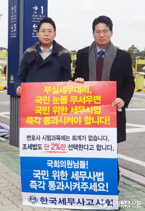 (조세금융신문=김용진 기자) 김희철 한국세무사고시회 사업 부회장님과 이석정 부회장(오른쪽)이 29일 국회 정문 앞에서 세무사법 개정안을 즉각 의결하라는 1인시위를 하고있다. (사진=한국세무사고시회 제공)