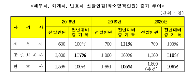 한편, 공인회계사는 2018년 최소합격인원을 2017년 선발인원인 850명에서 1000명으로 150명 증원했으며, 2020년에는 2019년 선발인원에서 100명이 늘어난 1100명으로 증원했다. 또, 변호사는 변호사시험을 통해 2018년 1599명, 2019년 1691명을 선발했으며 2020년에는 1800여명이 선발될 것으로 추정되고 있다.