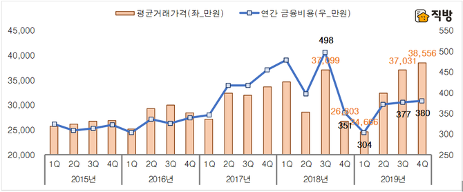 10일 직방에 따르면 LTV(주택담보대출비율) 40%를 가정해 아파트 구입 연간 금융비용을 시뮬레이션한 결과 2019년 4분기 연간금융비용은 380만원으로 3분기 377만원에 비해 소폭 상승했다. 전국 평균 아파트 매매 실거래가격은 4분기 3억8556만원으로 3분기 3억7031만원에 비해 1525만원 상승한 것으로 조사됐다.