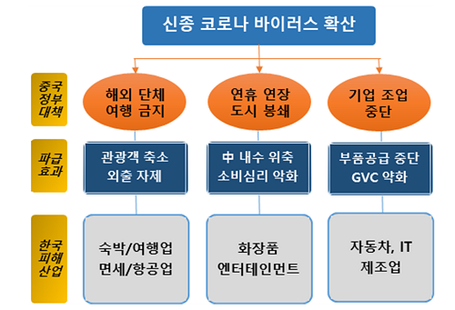 이 보고서에 따르면 신종 코로나 바이러스 확산으로 인해 관광객 축소와 외출자제, 중국 내수 위축 등이 나타나 유통업·호텔업·항공업·화장품업 등에 직접적인 피해가 예상된다. 또 중국 기업 조업중단이 장기화되면 공급망 타격으로 인한 글로벌 가치사슬(GVC) 약화로 정보기술(IT), 자동차 등 대부분의 국내 제조업으로 충격이 확산될 수 있다고 분석했다.