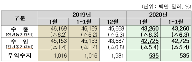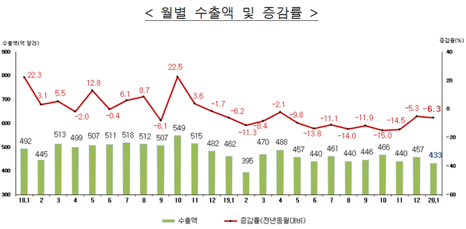 (조세금융신문=고승주 기자) 1월 수출이 지난해 1월 대비 6.3% 감소한 433억 달러로 집계됐다.