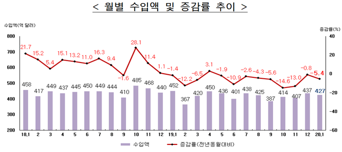 수입은 전년 동월 대비 5.4% 감소한 427억 달러로 원유(12.1%)·정밀기기(1.3%)·조제식품(1.2%)은 늘었지만, 가스(△7.2%)·기계류(△14.3%)·의류(△8.1%)는 감소했다.