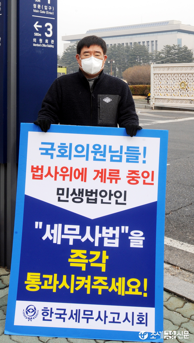 (조세금융신문=김용진 기자) 이창식 한국세무사고시회 총무 부회장이 21일 오전 국회 정문 앞에서 법사위에 계류중인 민생법안인 세무사법을 즉각 의결하라는 1인 시위를 하고 있다.
