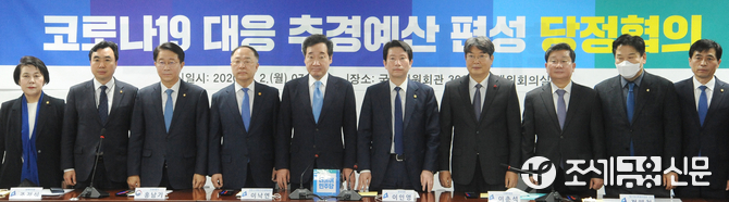 (조세금융신문=김용진 기자) 2일 오전 국회 의원회관에서 열린 신종 코로나바이러스 감염증(코로나19) 대응 추경예산 편성 당정협의에 앞서 이낙연 코로나19 재난안전대책위원장과 이인영 더불어민주당 원내대표, 홍남기 경제부총리 겸 기획재정부 장관 등 참석자들이 기념촬영을 하고 있다.