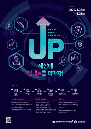 (조세금융신문=방영석 기자) 교보생명은 생명보험사회공헌위원회, 재단법인 홍합밸리와 함께 ‘2020 세상에 임팩트를 더하자, 업(UP)’(이하 임팩트업) 참가기업을 모집한다고 23일 밝혔다.