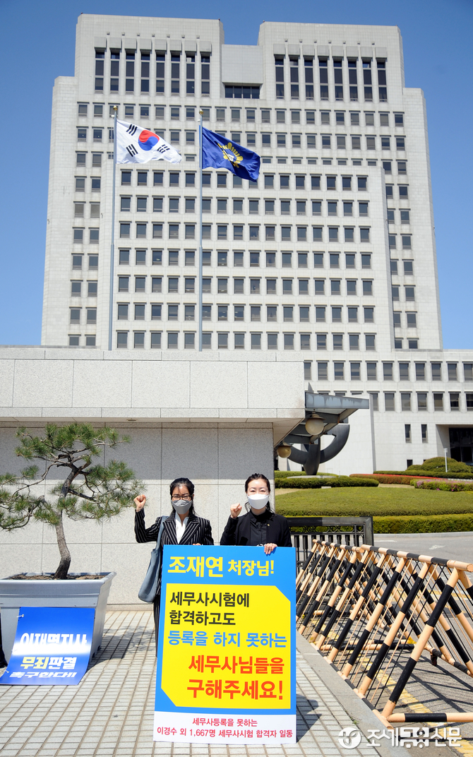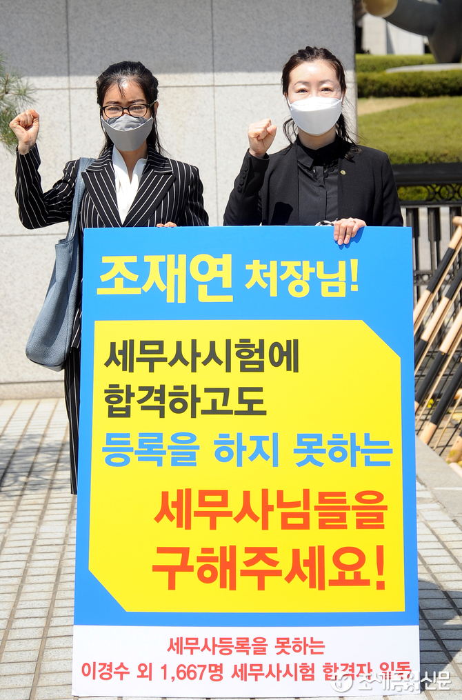 [포토뉴스]시위 하는 한국세무사고시회 곽장미 회장(왼쪽)과 배미영 상임이사