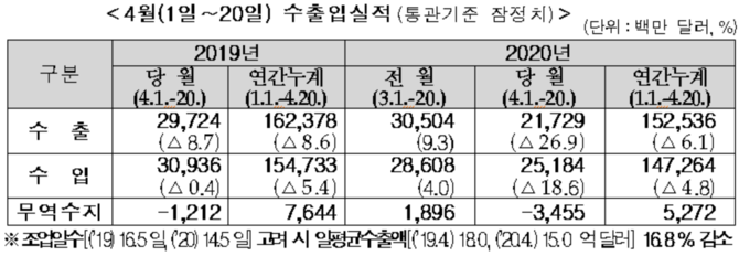 (조세금융신문=고승주 기자) 4월 1~20일 통관기준 잠정 수출액은 217억 달러로 지난해보다 26.9%(79.9억 달러) 감소된 것으로 나타났다.