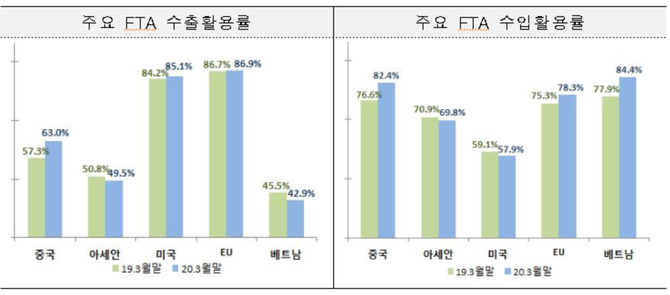 우리나라 최대 교역국인 중국과는 지난해 같은 기간보다 전체 교역액이 7.6% 감소했지만, FTA 활용률은 수출이 5.7%p, 수입이 5.8%p 증가했다.