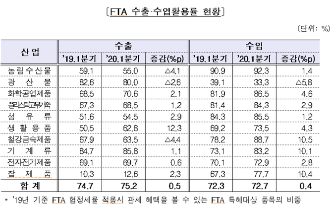 FTA 활용률은 수출 75.2%, 수입 72.7%로 지난해 같은 시기보다 각각 0.5%p, 0.4%p 증가했다.