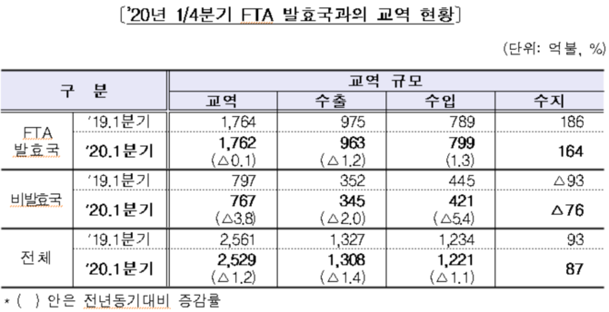 (조세금융신문=고승주 기자) 올 1분기 수출이 코로나19로 인해 지난해 같은 시기보다 2% 하락한 가운데 FTA 교역국간 무역에서는 1.2% 하락에 그친 것으로 드러났다.