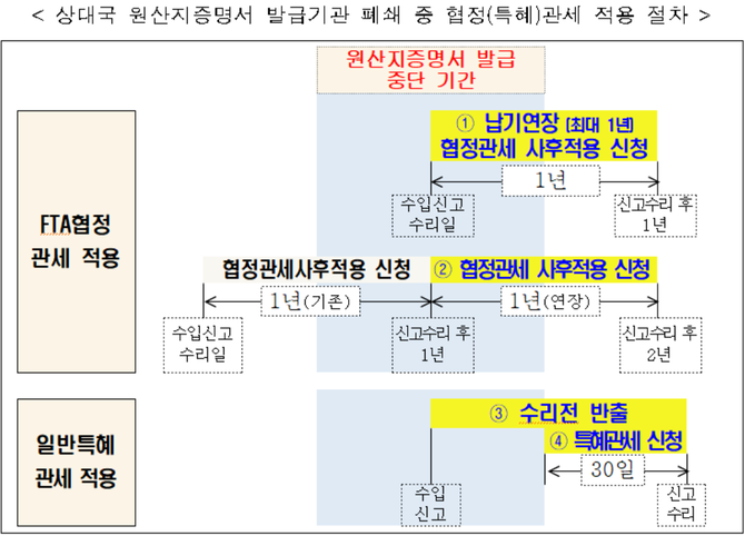 만일 원산지증명서 발급이 중단된 기간 중 협정관세 사후적용 신청기한(수입신고수리일로부터 1년)이 끝나 협정관세 사후적용을 받지 못할 경우에 대해서는 사후적용 신청기한을 최대 1년까지 연장한다.