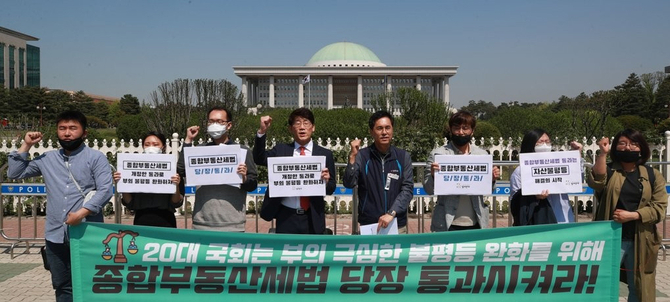 참여연대 조세재정개혁센터는 6일 오전 서울 여의도 국회 앞 기자회견에서 우리나라의 자산 불평등이 심각한 수준이라는 것은 누구도 부인할 수 없는데도 종부세법 개정안 논의를 외면하는 여야를 규탄한다며 20대 국회에서 관련법이 당장 통과돼야 한다고 촉구했다.