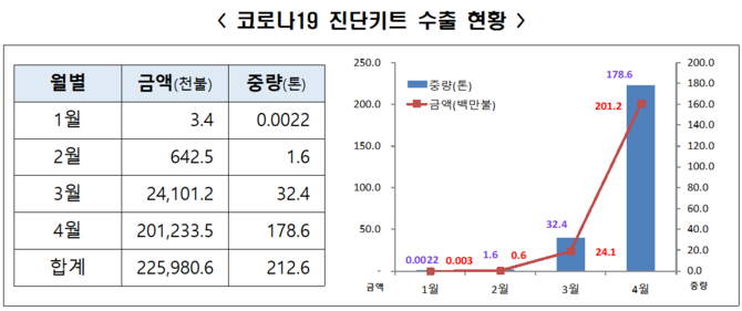 지난 1~2월까지는 미미했으나, 코로나19가 대유행한 3월 들어 증가하기 시작해 4월에는 전월대비 수출금액이 8.35배 급증했다.