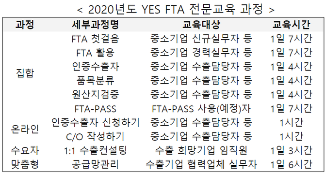YES FTA 전문교육은 집합, 온라인, 수요자맞춤형으로 3개 과정에 총 10개 세부과정으로 구성됐다.