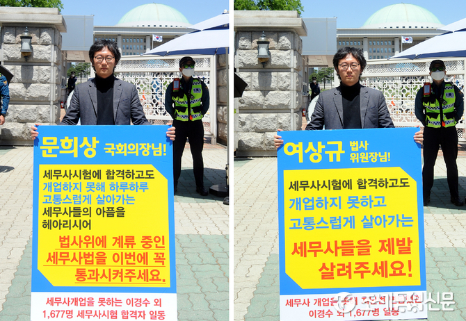 (조세금융신문=김용진 기자) 김현배 한국세무사고시회 지방 청년 상임 이사가 13일 오전 국회 정문앞에서 문희상 국회의장과 여상규 법사위원장에게 "이경수 동기 회장 외 제56기 1677명이 세무사 시험에 합격 하고도 개업을 하지 못해 하루하루 고통스럽게 살아가고 있다"며 국회에 계류중인 세무사법을 통과 시켜줄 것을 요구하고 있다.