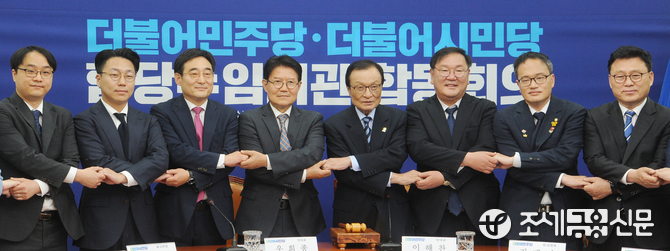 (조세금융신문=김용진 기자) 이해찬(중앙) 더불어민주당 대표가 13일 오후 국회 본청에서 열린 더불어민주당-더불어시민당 합당수임기관 합동회의에 앞서 김태년(왼쪽에서 6번째) 더불어민주당 원내대표, 우희종(왼쪽에서 4번째) 더불어시민당 대표와 손을 맞 잡고 기념 촬영을 하고 있다